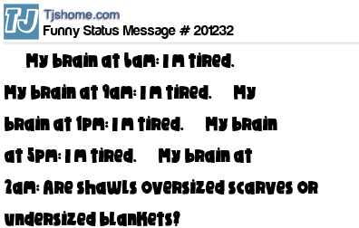 X says My brain at 6am: I’m tired. My brain at 9am: I’m tired. My brain at 1pm: I’m tired. My brain at 5pm: I’m tired. My brain at 2am: Are shawls oversized scarves or undersized blankets?
