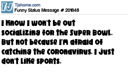 X is I know I won't be out socializing for the Super Bowl. But not because I'm afraid of catching the Coronavirus, I just don't like sports.