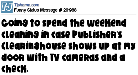 X is Going to spend the weekend cleaning in case Publisher's Clearinghouse shows up at my door with TV cameras and a check.