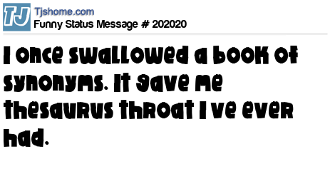 X says I once swallowed a book of synonyms. It gave me thesaurus throat I’ve ever had.