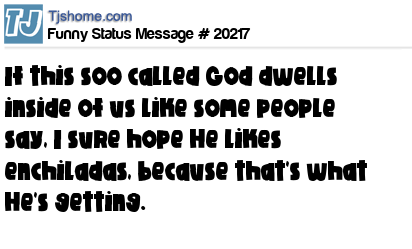 - # 113800 If God dwells inside us like some people say, I sure hope He likes enchiladas, because that's what He's getting.