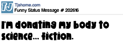 - # 197304 me: [donating body to science] science: [donates my body to goodwill]