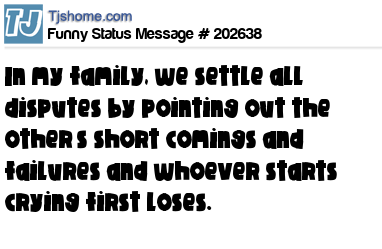 X says In my family, we settle all disputes by pointing out the other’s short comings and failures and whoever starts crying first loses.