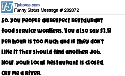 X is So, you people disrespect restaurant food service workers. You also say $2.13 per hour is too much and if they don't like it they should find another job. Now, your local restaurant is closed. Cry me a river.