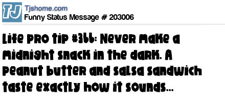 - # 203459 Life pro tip #366: Never make a midnight snack in the dark. A peanut butter and salsa sandwich taste exactly how it sounds