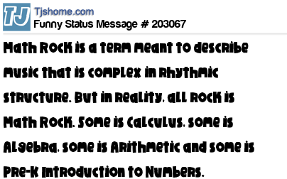 X says Math Rock is a term meant to describe music that is complex in rhythmic structure. But in reality, all rock is Math Rock. Some is Calculus, some is Algebra, some is Arithmetic and some is Pre-K Introduction to Numbers.