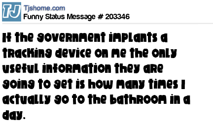 - # 199791 If the government implants a tracking device on me the only useful information they are going to get is how many times I actually pee in a day.