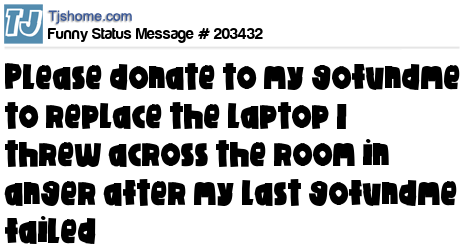 X says Please donate to my gofundme to replace the laptop I threw across the room in anger after my last gofundme failed
