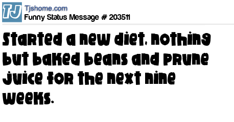 X says Started a new diet, nothing but baked beans and prune juice for the next nine weeks.