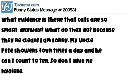 X says What evidence is there that cats are so smart, anyway? What do they do? Because they’re clean? I am sorry. My Uncle Pete showers four times a day and he can’t count to ten. So don’t give me hygiene.