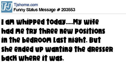 X says I am whipped today.....My wife had me try three new positions in the bedroom last night. But she ended up wanting the dresser back where it was.