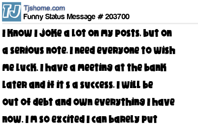 X says I know I joke a lot on my posts, but on a serious note, I need everyone to wish me luck. I have a meeting at the bank later and if it’s a success, I will be out of debt and own everything I have now. I’m so excited I can barely put on my ski mask