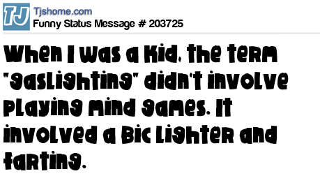 - # 208479 When I was a kid, the term "gaslighting" didn't involve playing mind games. It involved a Bic lighter and a fart.