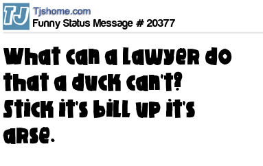 X  What can a lawyer do that a duck can't? Stick it's bill up it's arse.