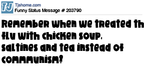 X says Remember when we treated the flu with chicken soup, saltines and tea instead of commmunism?