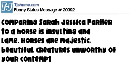 - # 24180 has been asked to change his status regarding SATC2. Apparently PETA didn't take too well at me comparing Sarah Jessica Parker/Carrie to a horse. It was harsh on horses worldwide..... I am sorry......