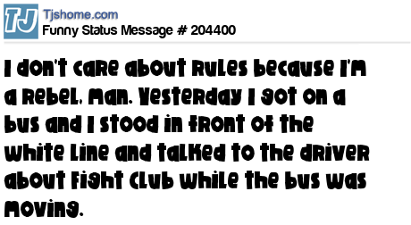 X says I don't care about rules because I'm a rebel, man. Yesterday I got on a bus and I stood in front of the white line and talked to the driver about Fight Club while the bus was moving.