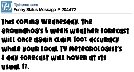 X says This coming Wednesday, the groundhog's 6 week weather forecast will once again claim 100% accuracy while your local TV meteorologist's 5 day forecast will hover at its usual 1%.