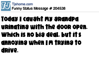 X says Today I caught my grandpa urinating with the door open. Which is no big deal, but it’s annoying when I’m trying to drive.