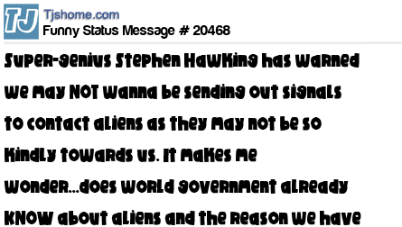 X is Super-genius Stephen Hawking has warned we may NOT wanna be sending out signals to contact aliens as they may not be so kindly towards us. It makes me wonder...does world government already KNOW about aliens and the reason we have a huge overabundance of