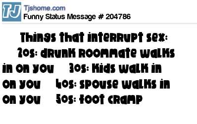 X says Things that interrupt sex: 20s: drunk roommate walks in on you 30s: kids walk in on you 40s: spouse walks in on you 50s: foot cramp