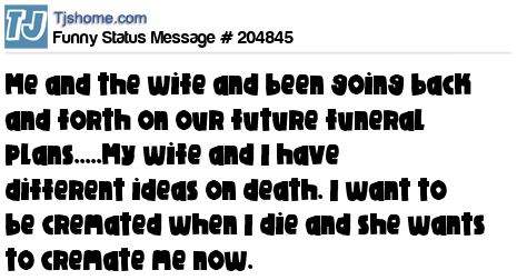 X says Me and the wife and been going back and forth on our future funeral plans.....My wife and I have different ideas on death. I want to be cremated when I die and she wants to cremate me now.