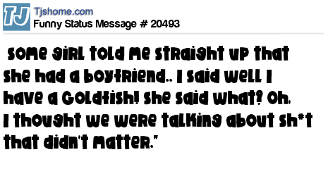 X some girl told me straight up that she had a boyfriend.. I said well I have a Goldfish! she said what? Oh, I thought we were talking about sh*t that didn't matter."