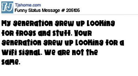 X says My generation grew up looking for frogs and stuff. Your generation grew up looking for a WiFi signal. We are not the same.