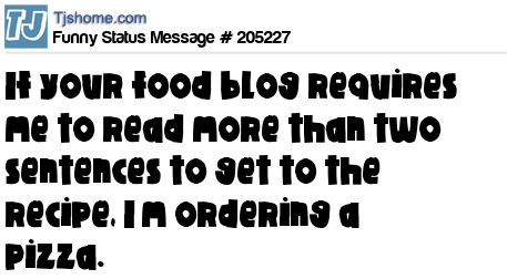X says If your food blog requires me to read more than two sentences to get to the recipe, I’m ordering a pizza.