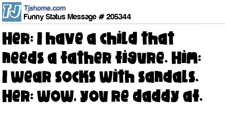X says Her: I have a child that needs a father figure. Him: I wear socks with sandals. Her: wow, you’re daddy af.