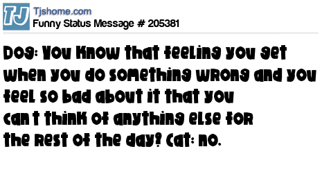 X says Dog: You know that feeling you get when you do something wrong and you feel so bad about it that you can’t think of anything else for the rest of the day? Cat: no.