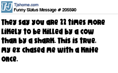 X says They say you are 22 times more likely to be killed by a cow than by a shark. This is true, my ex chased me with a knife once.