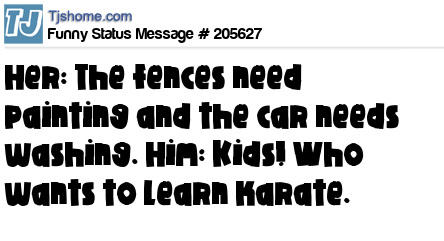 X says Her: The fences need painting and the car needs washing. Him: Kids! Who wants to learn karate.