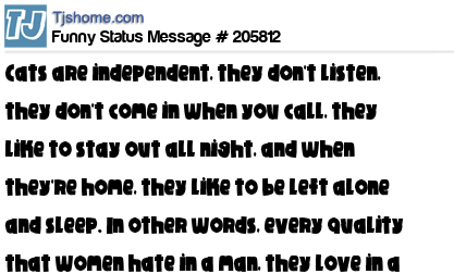 - # 26022 I have never understood why women love cats. Cats are independent, they don't listen, they don't come in when you call, they like to stay out all night, and when they're home they like to be left alone and sleep. In other words, every quality that women h