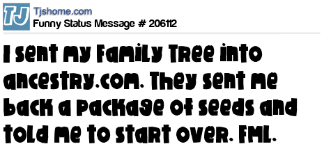 - # 182039 I sent my family tree into Ancestry.com. They sent me back a packet of seeds and told me to start over. FML.