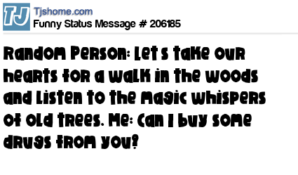 X says Random Person: Let’s take our hearts for a walk in the woods and listen to the magic whispers of old trees. Me: Can I buy some drugs from you?
