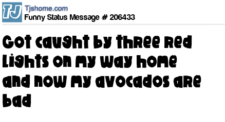 X says Got caught by three red lights on my way home and now my avocados are bad