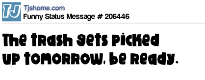 - # 129334 Its trash pick up day tomorrow and my dumb neighbor forgot to take out my mother-n-law!!!! Now i've gotta dump trash all over his yard again!