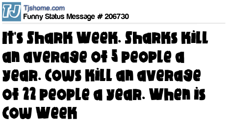 X says It's Shark Week. Sharks kill an average of 5 people a year. Cows kill an average of 22 people a year. When is Cow Week