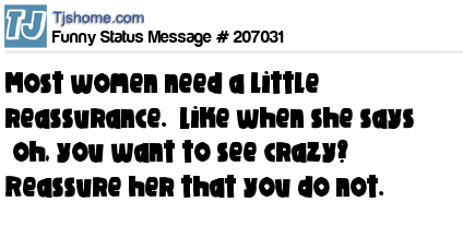 X says Most women need a little reassurance. Like when she says “oh, you want to see crazy?” Reassure her that you do not.