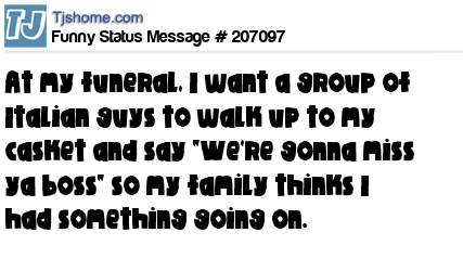 X says At my funeral, I want a group of Italian guys to walk up to my casket and say "We're gonna miss ya boss" so my family thinks I had something going on.