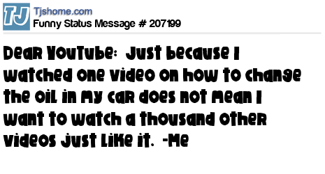 X says Dear YouTube: Just because I watched one video on how to change the oil in my car does not mean I want to watch a thousand other videos just like it. -Me
