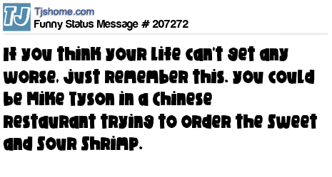 - # 172159 If you think your life can't get any worse, just remember...you could be Mike Tyson in a Chinese restaurant trying to order the Sweet and Sour Shrimp.