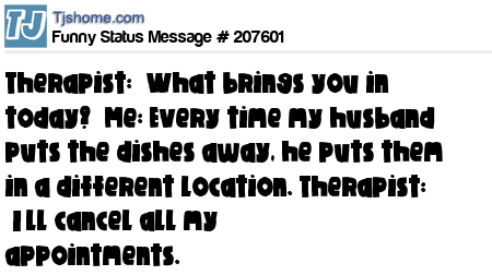 X says Therapist: “What brings you in today?” Me: Every time my husband puts the dishes away, he puts them in a different location. Therapist: “I’ll cancel all my appointments.”