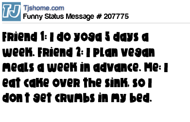 X says Friend 1: I do yoga 5 days a week. Friend 2: I plan vegan meals a week in advance. Me: I eat cake over the sink, so I don’t get crumbs in my bed.