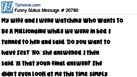 X says My wife and I were watching Who Wants To Be A Millionaire while we were in bed. I turned to her and said, 'Do you want to have Sex?' 'No,' she answered. I then said, 'Is that your final answer?' She didn't even look at me this time, simply saying 'Yes.' S