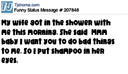- # 204448 My wife got in the shower with me this morning. She said “Mmm baby I want you to do bad things to me”. So I put shampoo in her eyes.