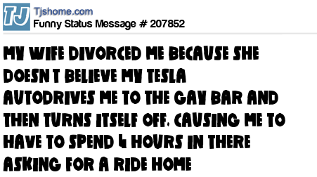 X says MY WIFE DIVORCED ME BECAUSE SHE DOESN’T BELIEVE MY TESLA AUTODRIVES ME TO THE GAY BAR AND THEN TURNS ITSELF OFF, CAUSING ME TO HAVE TO SPEND 4 HOURS IN THERE ASKING FOR A RIDE HOME