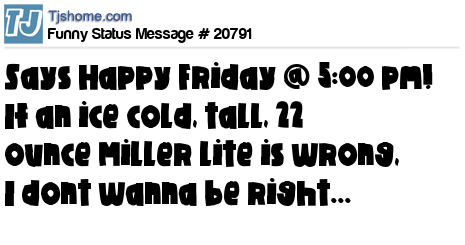 X is says Happy Friday @ 5:00 pm! If an ice cold, tall, 22 ounce Miller Lite is wrong, I dont wanna be right...