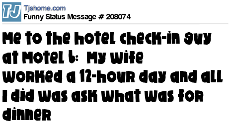 X says Me to the hotel check-in guy at Motel 6: “My wife worked a 12-hour day and all I did was ask what was for dinner”